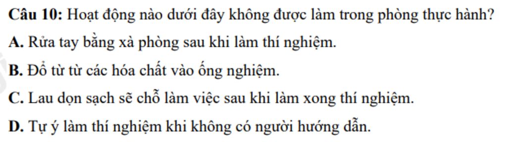 Câu 10: Hoạt động nào dưới đây không được làm trong phòng thực hành?