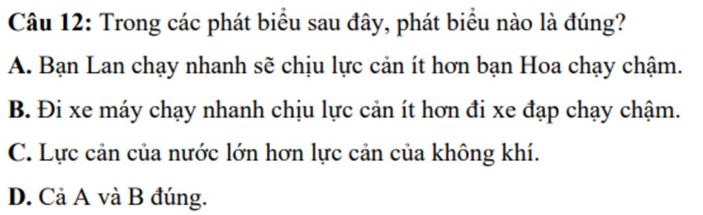`+` `A.` sai vì đi càng nhanh thì càng chịu tác dụng lực cản càng lớn