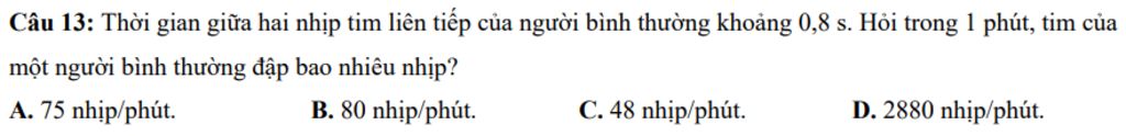 Câu 13: Thời gian giữa hai nhịp tim liên tiếp của người bình thường khoảng 0,8 s. Hỏi trong 1 phút, tim của một người bình thường đập bao nhiêu nhịp?