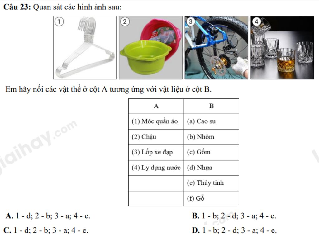 Câu 23: Quan sát các hình ảnh sau: Em hãy nối các vật thể ở cột A tương ứng với vật liệu ở cột B