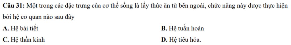 Câu 31: Một trong các đặc trưng của cơ thể sống là lấy thức ăn từ bên ngoài, chức năng này được thực hiện bởi hệ cơ quan nào sau đây: