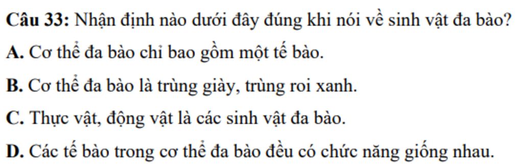 Câu 33: Nhận định nào dưới đây đúng khi nói về sinh vật đa bào?