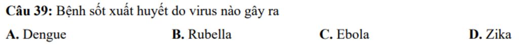 Câu 39: Bệnh sốt xuất huyết do virus nào gây ra