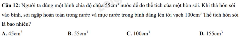 Câu 12: Người ta dùng một bình chia độ chứa 55cm3 nước để đo thể tích của một hòn sỏi. Khi thả hòn sỏi vào bình, sỏi ngập hoàn toàn trong nước và mực nước trong bình dâng lên tới vạch 100cm3 Thể tích hòn sỏi là bao nhiêu?