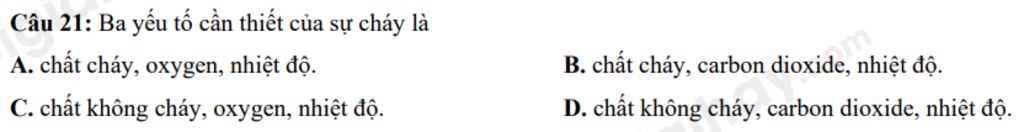 Câu `21:` Ba yếu tố cần thiết của sự cháy là :
