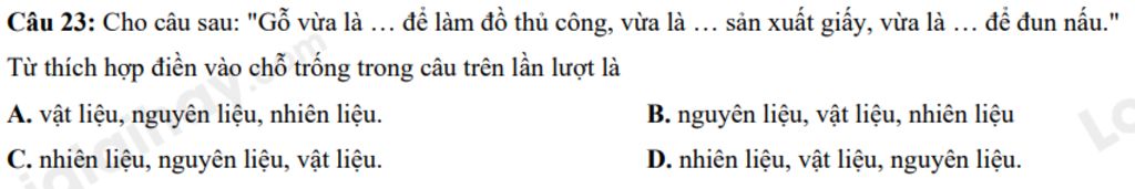 Câu 23: Cho câu sau: "Gỗ vừa là … để làm đồ thủ công, vừa là … sản xuất giấy, vừa là … để đun nấu." Từ thích hợp điền vào chỗ trống trong câu trên lần lượt là