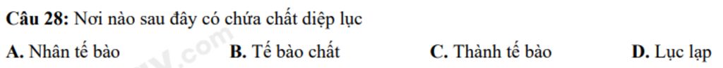 `=>` lục lạp là nơi có nhiều chất diệp lục nhất và nó thường ở trong các loại thực vật. `=>` chọn `D`