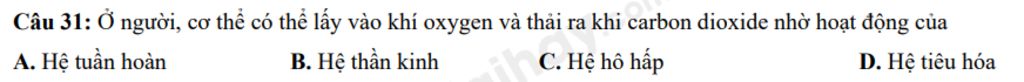 Câu `31:` Ở người, cơ thể có thể lấy vào khí $oxygen(O)$ và thải ra khi $carbon dioxide$`(CO_{2})` nhờ hoạt động của :