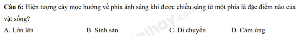 Câu 6: Hiện tượng cây mọc hướng về phía ánh sáng khi được chiếu sáng từ một phía là đặc điểm nào của vật sống?