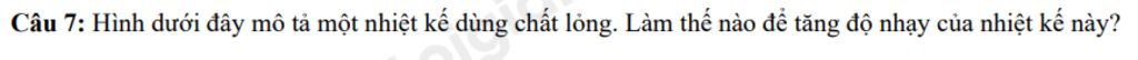 Câu 7: Hình dưới đây mô tả một nhiệt kế dùng chất lỏng. Làm thế nào để tăng độ nhạy của nhiệt kế này?
