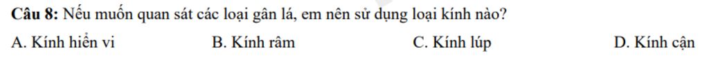 Câu 8: Nếu muốn quan sát các loại gân lá, em nên sử dụng loại kính nào?
