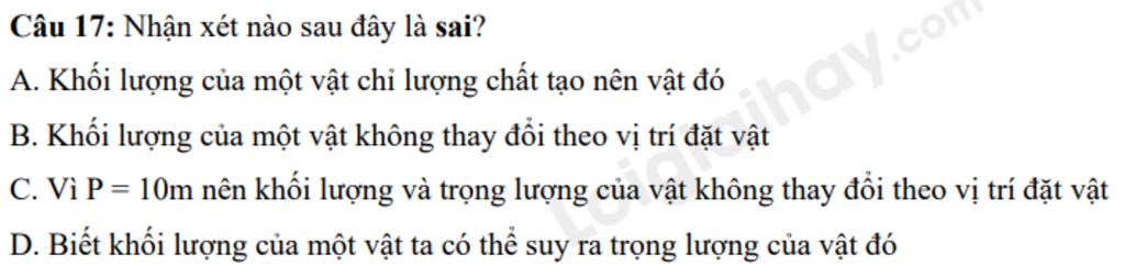 D. Biết khối lượng của một vật ta có thể suy ra trọng lượng của vật đó `=>` Đúng (P = 10m ở trên trái đất)