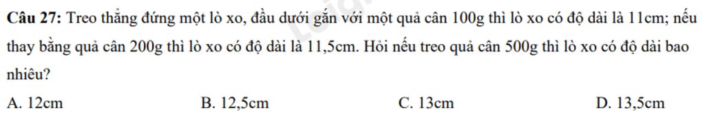 Câu `27:` Treo thẳng đứng một lò xo, đầu dưới gắn với một quả cân `100g` thì lò xo có độ dài là `11cm;` nếu thay bằng quả cân `200g` thì lò xo có độ dài là `11,5cm`. Hỏi nếu treo quả cân `500g` thì lò xo có độ dài bao nhiêu?
