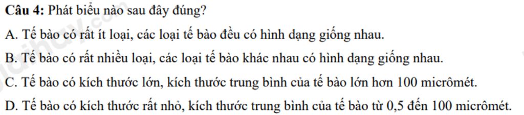 `-` Các loại tế bào đều có kích thước rất nhỏ, kích thước trung bình khoảng từ `0,5` đến `100` $micromet (amu).$
