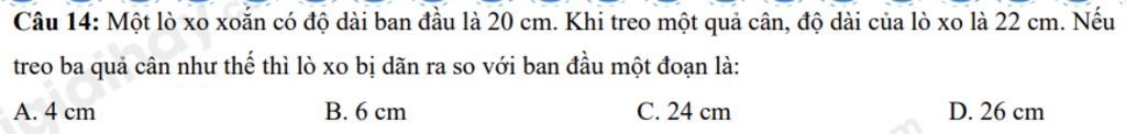 Câu 14: Một lò xo xoắn có độ dài ban đầu là 20 cm. Khi treo một quả cân, độ dài của lò xo là 22 cm. Nếu treo ba quả cân như thế thì lò xo bị dãn ra so với ban đầu một đoạn là:
