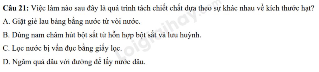 `-` Câu `21:` Việc làm nào sau đây là quá trình tách chiết chất dựa theo sự khác nhau về kích thước hạt `?`