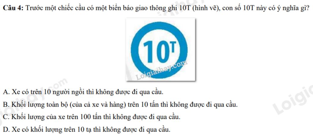 Câu `4:` Trước một chiếc cầu có một biển báo giao thông ghi 10T (hình vẽ), con số 10T này có ý nghĩa gì?