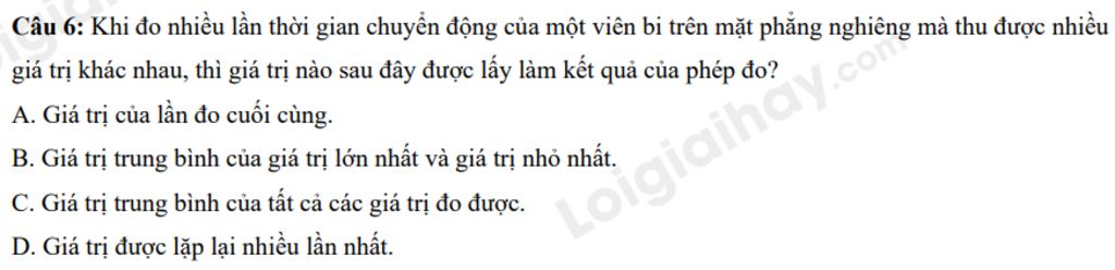 Câu 6: Khi đo nhiều lần thời gian chuyển động của một viên bi trên mặt phẳng nghiêng mà thu được nhiều giá trị khác nhau, thì giá trị nào sau đây được lấy làm kết quả của phép đo?