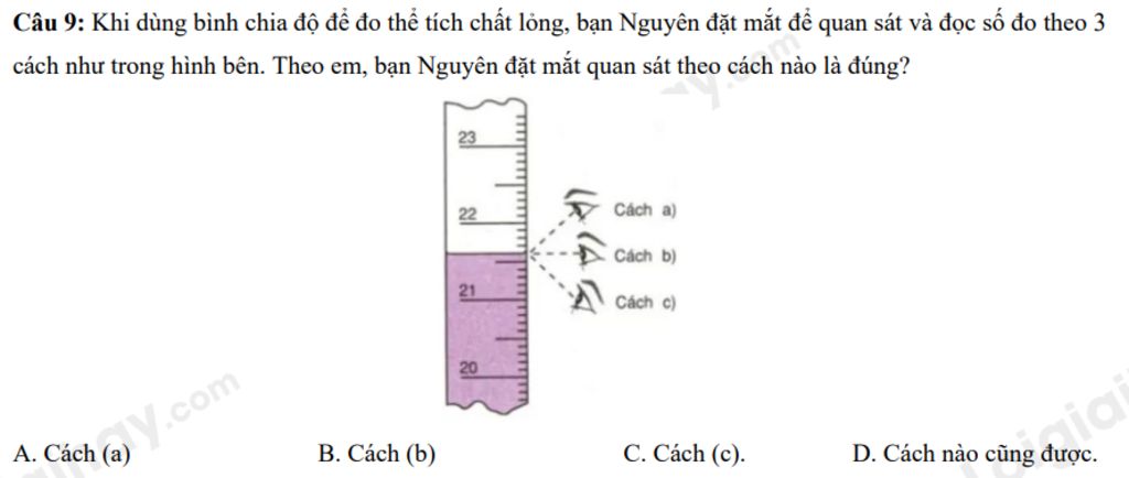 Câu 9: Khi dùng bình chia độ để đo thể tích chất lỏng, bạn Nguyên đặt mắt để quan sát và đọc số đo theo 3 cách như trong hình bên. Theo em, bạn Nguyên đặt mắt quan sát theo cách nào là đúng?