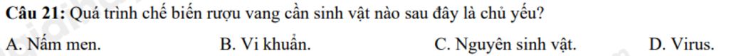 `star` Quá trình chế biến rượu vang cần sinh vật chủ yếu là:
