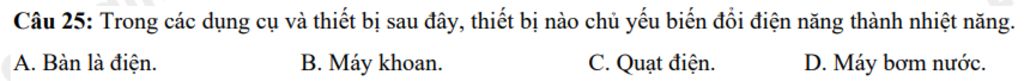 Câu `25` : Trong các dụng cụ và thiết bị sau đây, thiết bị nào chủ yếu biến đổi điện năng thành nhiệt năng ?