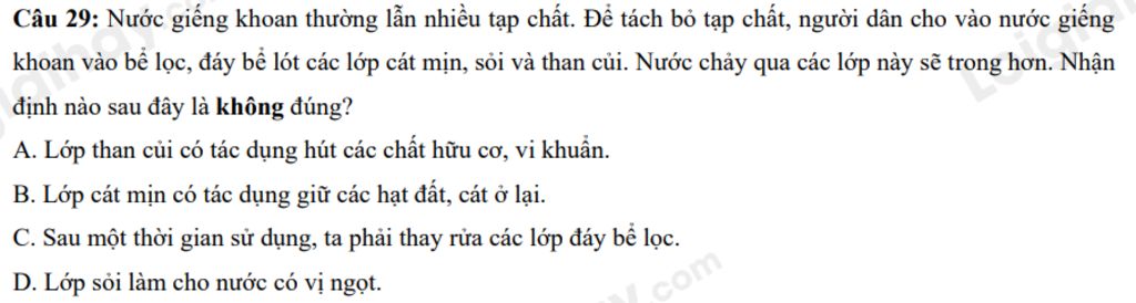 Câu 29: Nước giếng khoan thường lẫn nhiều tạp chất. Để tách bỏ tạp chất, người dân cho vào nước giếng khoan vào bể lọc, đáy bể lót các lớp cát mịn, sỏi và than củi. Nước chảy qua các lớp này sẽ trong hơn. Nhận định nào sau đây là không đúng?