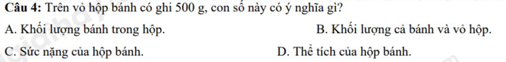 `=>` số `500g` chỉ khối lượng bánh có trong hộp( có thể tính cả khối lượng của cái vỏ) `=>` chọn `A`