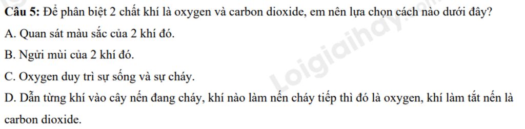Câu 5 : Để phân biệt 2 chất khí là oxygen và carbon dioxide, em nên lựa chọn các nào dưới đây?
