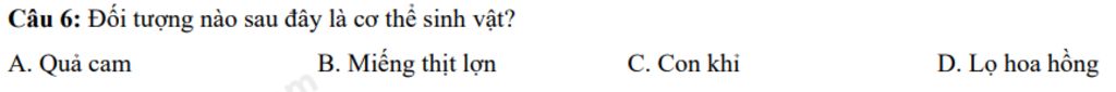 `-` Con khỉ là cơ thể động vật. Quả cam và miếng thịt lợn chỉ là một phần của cơ thể sinh vật. Lọ hoa hồng không phải là cơ thể sinh vật hay một phần của cơ thể sinh vật.