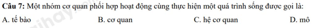 `->` Một nhóm cơ quan phối hợp hoạt động cùng thực hiện một quá trình sống được gọi là: hệ cơ quan