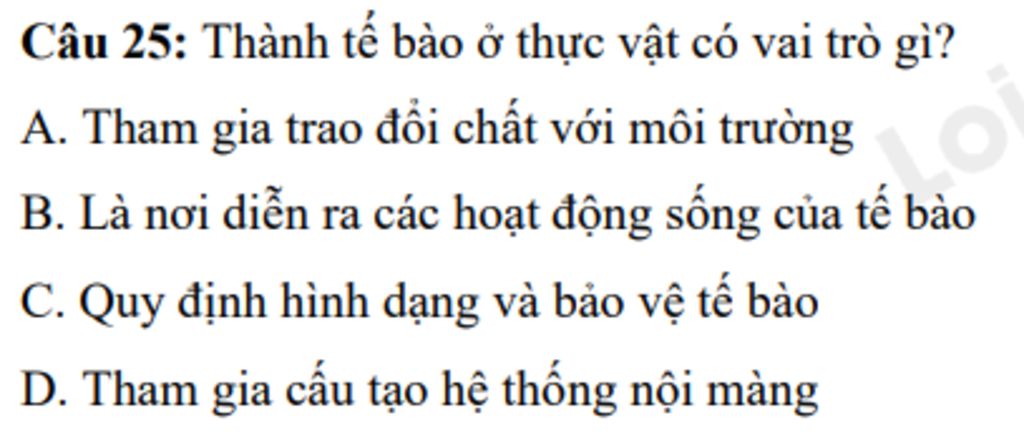 ⇒ Thành tế bào ở thực vật có vai trò thực hiện quá trình trao đổi chất với môi trường xung quanh cụ thể là hấp thụ chất dinh dưỡng và thải ra chất cặn bã ra ngoài môi trường.