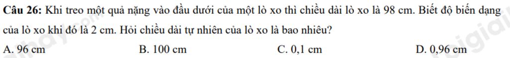 Câu 26: Khi treo một quả nặng vào đầu dưới của một lò xo thì chiều dài lò xo là 98 cm. Biết độ biến dạng của lò xo khi đó là 2 cm. Hỏi chiều dài tự nhiên của lò xo là bao nhiêu?