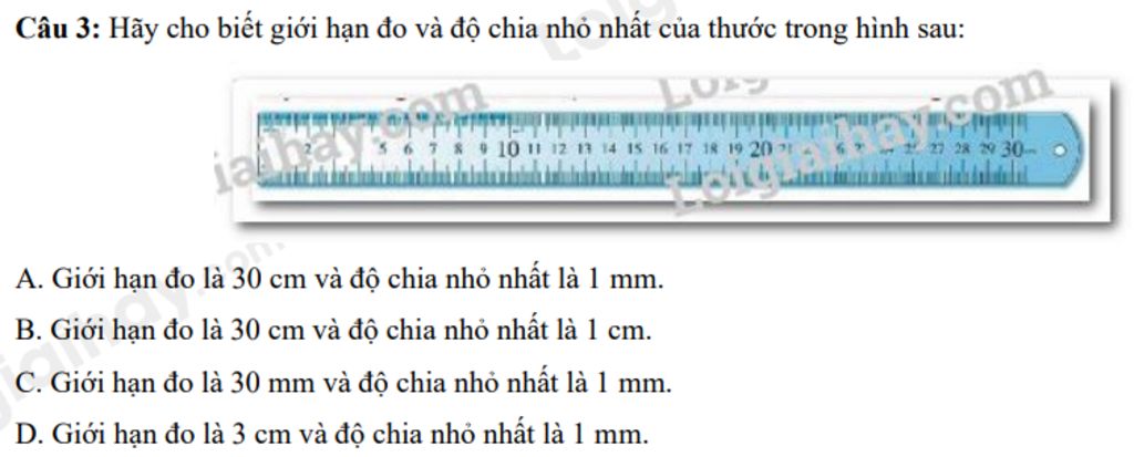 D. Giới hạn đo là 3 cm và độ chia nhỏ nhất là 1 mm.