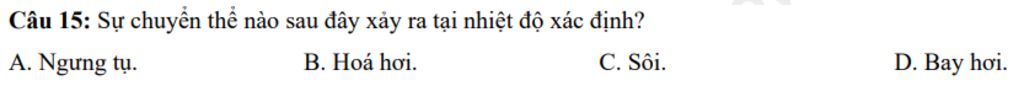 Câu `15:` Sự chuyển thể nào sau đây xảy ra tại nhiệt độ xác định?