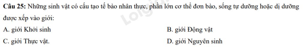 Câu 25: Những sinh vật có cấu tạo tế bào nhân thực, phần lớn cơ thể đơn bào, sống tự dưỡng hoặc dị dưỡng được xếp vào giới: