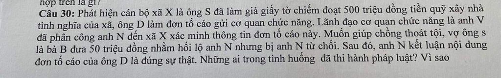 4. Anh N: Anh N đã từ chối hối lộ và sau đó kết luận nội dung đơn tố cáo của ông D là đúng. Hành vi này tuân thủ pháp luật và đúng quy trình xác minh thông tin.