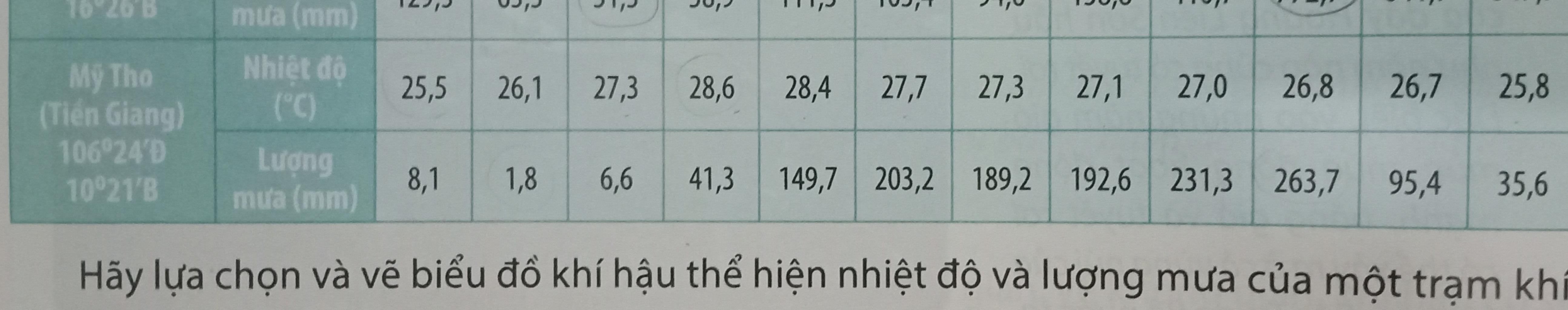 `star` Phân tích biểu đồ khí hậu của trạm Mỹ Tho (Tiền Giang) `106°24'Đ` `10°21'B`: