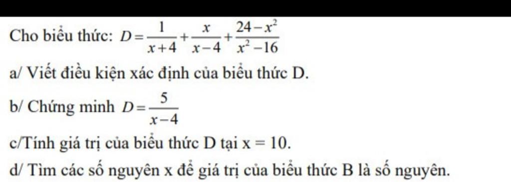 b) Ta có: $D = \frac{1}{x+4} + \frac{x}{x-4} + \frac{24-x^2}{x^2-16}$