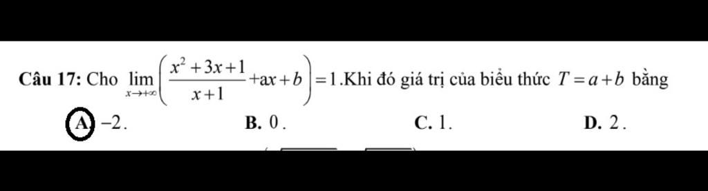GT \to \mathop {\lim }\limits_{x \to + \infty } \left( {\dfrac{{{x^2} + 3x + 1}}{{x + 1}} + ax + b} \right) = 1\\