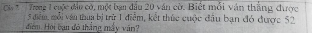 Giả sử bạn đó thắng cả 20 ván thì số điểm là: 20 × 5 = 100 (điểm) Số điểm bị tụt là: 100 − 52 = 48 (điểm) Số ván thua là: 48 : ( 5 + 1 ) = 8 (ván) Bạn đó thắng số ván là: 20 − 8 = 12 (ván) Đáp số: 12 ván