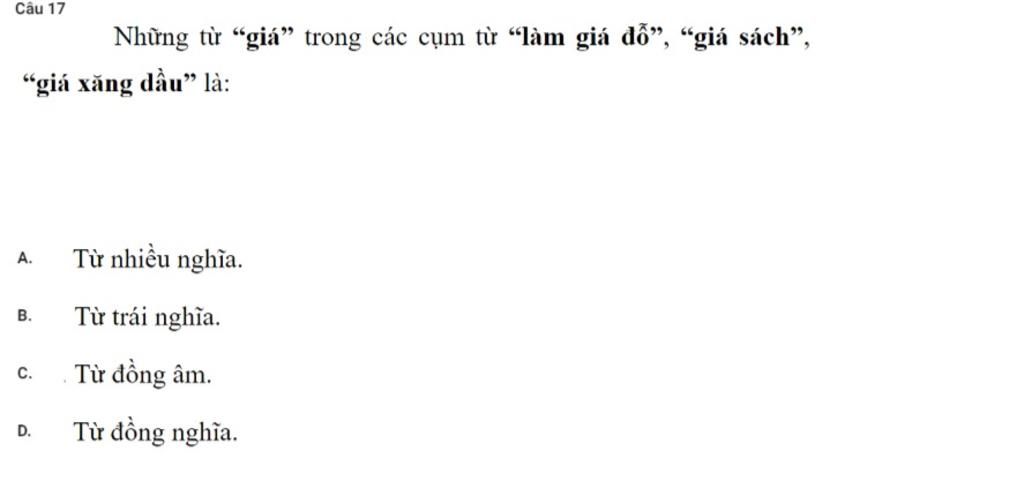 → Các từ không lquan với nhau , khác hẳn nhau → Chọn C . Từ Đồng Âm
