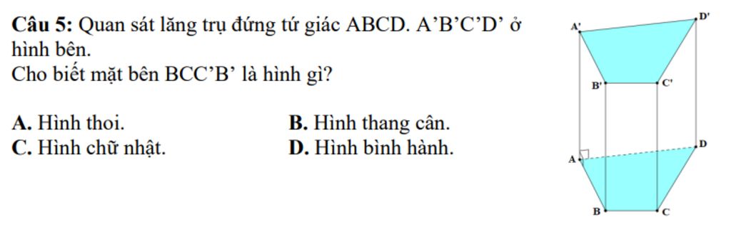 Câu 5: Quan sát lăng trụ đứng tứ giác ABCD. A’B’C’D’ ở