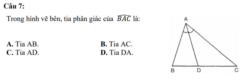 `-` Tia phân giác của `hat{BAC}` là tia `AD`