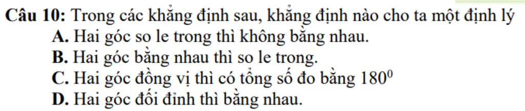 `B.` Sai, hai góc so le trong thì bằng nhau chứ không phải hai góc bằng nhau thì so le trong.