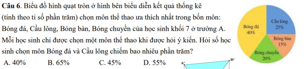 Vậy số học sinh chọn môn Bóng đá và Cầu lông chiếm `65%`.