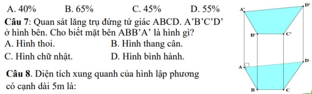 Câu 7: Quan sát lăng trụ đứng tứ giác ABCD. A’B’C’D’ ở hình bên. Cho biết mặt bên ABB’A’ là hình gì?