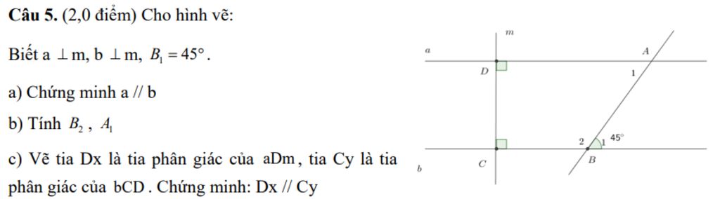`a////b to \hat[B_1]=\hat[A_1]=45^o` ( `2` góc so le trong )