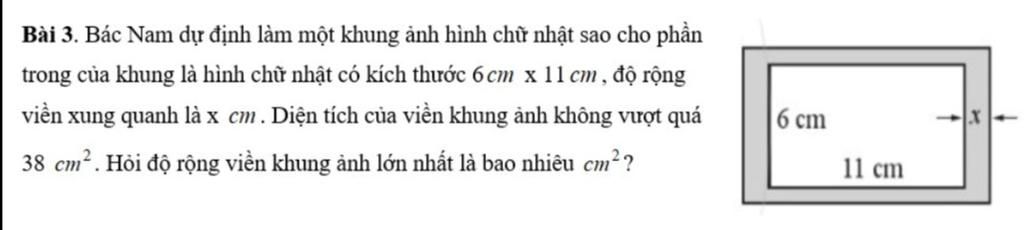 38 cm2. Hỏi độ rộng viền khung ảnh lớn nhất là bao nhiêu cm?