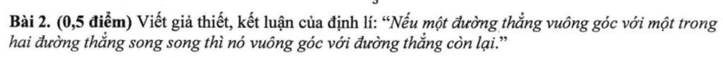 Bài 2. (0,5 điểm) Viết giả thiết, kết luận của định lí: “Nếu một đường thẳng vuông góc với một trong hai đường thẳng song song thì nó vuông góc với đường thẳng còn lại.”