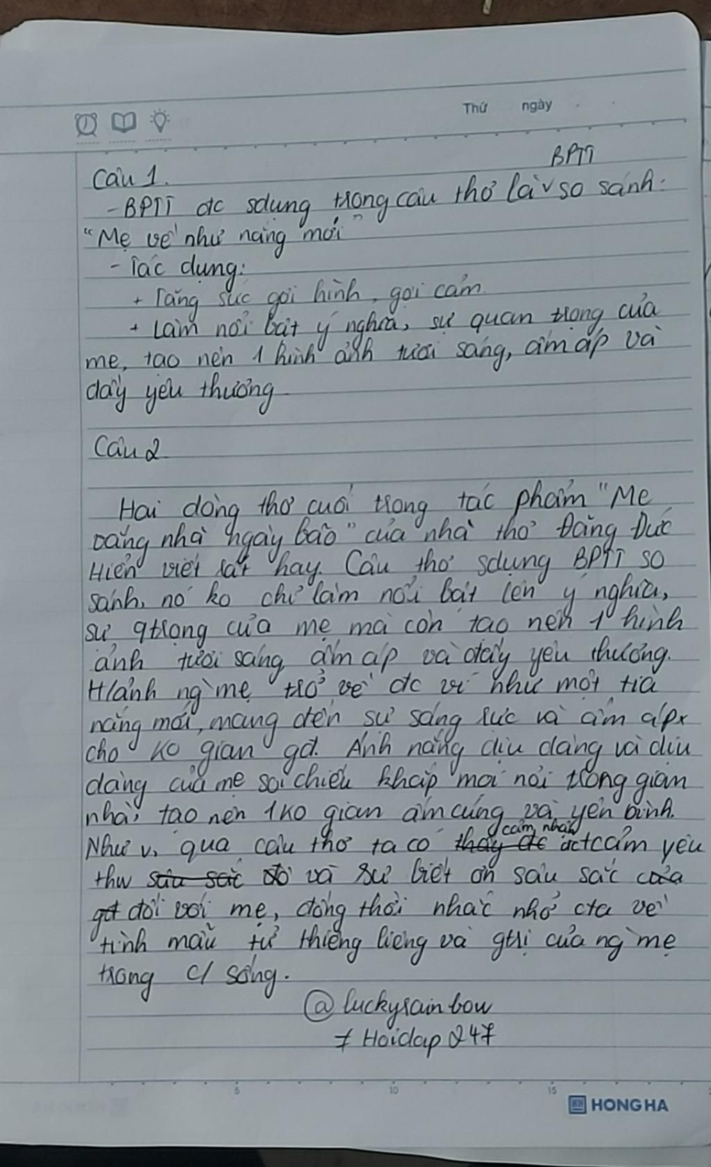 Trong tác phẩm "Mẹ vắng nhà ngày bão" của nhà thơ Đặng Đức Hiển đã viết một câu thơ rất hay rằng :"Mẹ về như nắng mới / Sáng ấm cả gian nhà" . Câu thơ sử dụng biện pháp tu từ so sánh làm nổi bật lên ý nghĩa , sự quan trong của mẹ . Khi mẹ về nhà gia đình như cảm nhận được sự ấm áp khác mọi nơi . Người mẹ được ví như nắng mới , một ánh nắng dịu dàng nhẹ nhàng soi chiếu khắp mọi nơi trong gian nhà . Qua đó mà ta có thể thấy được tình ảnh nồng nàn , thắm thiết của người con cũng như gia đình đối với người mẹ thân yêu , một tình cảm thiêng liêng đáng quý trọng .